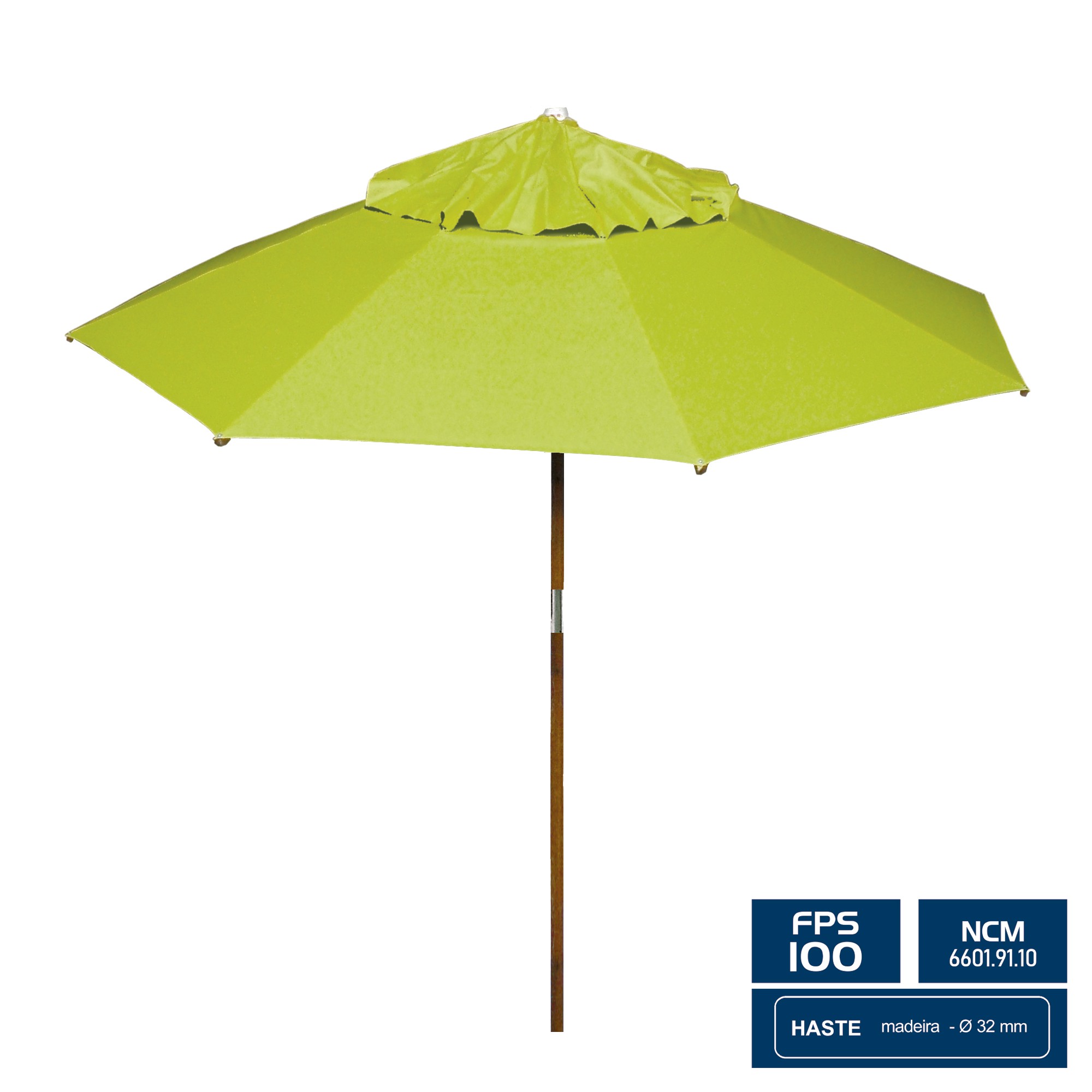 Usado principalmente em piscinas ou praias, proporciona grande área de sombra e proteção dos raios solares, dando um toque de sofisticação no ambiente externo da casa, excelente em jardins ou varandas. Possui haste central (Bi-Partida) e varetas em madeira envernizada, revestimento em lona PVC com trama de poliéster e ponteira em polipropileno.