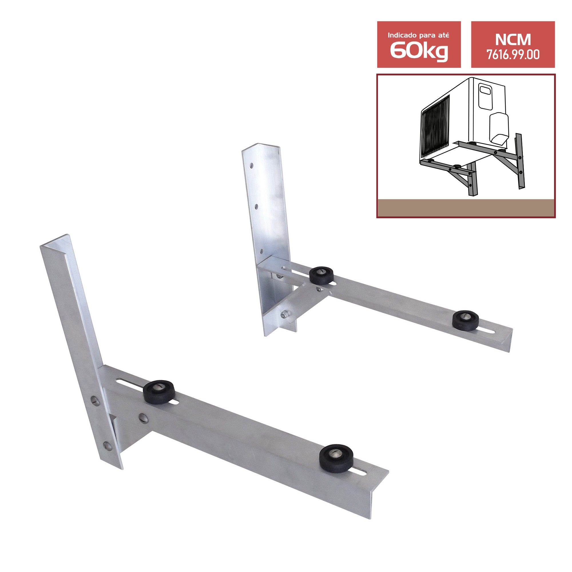Resistente não enferruja e suporta interpéries (sol, chuva, maresia). Utilizado externamente para sustenção de ar condicionado tipo Split. Acompanha parafusos, chumbadores, buchas, porcas e manual para instalação.