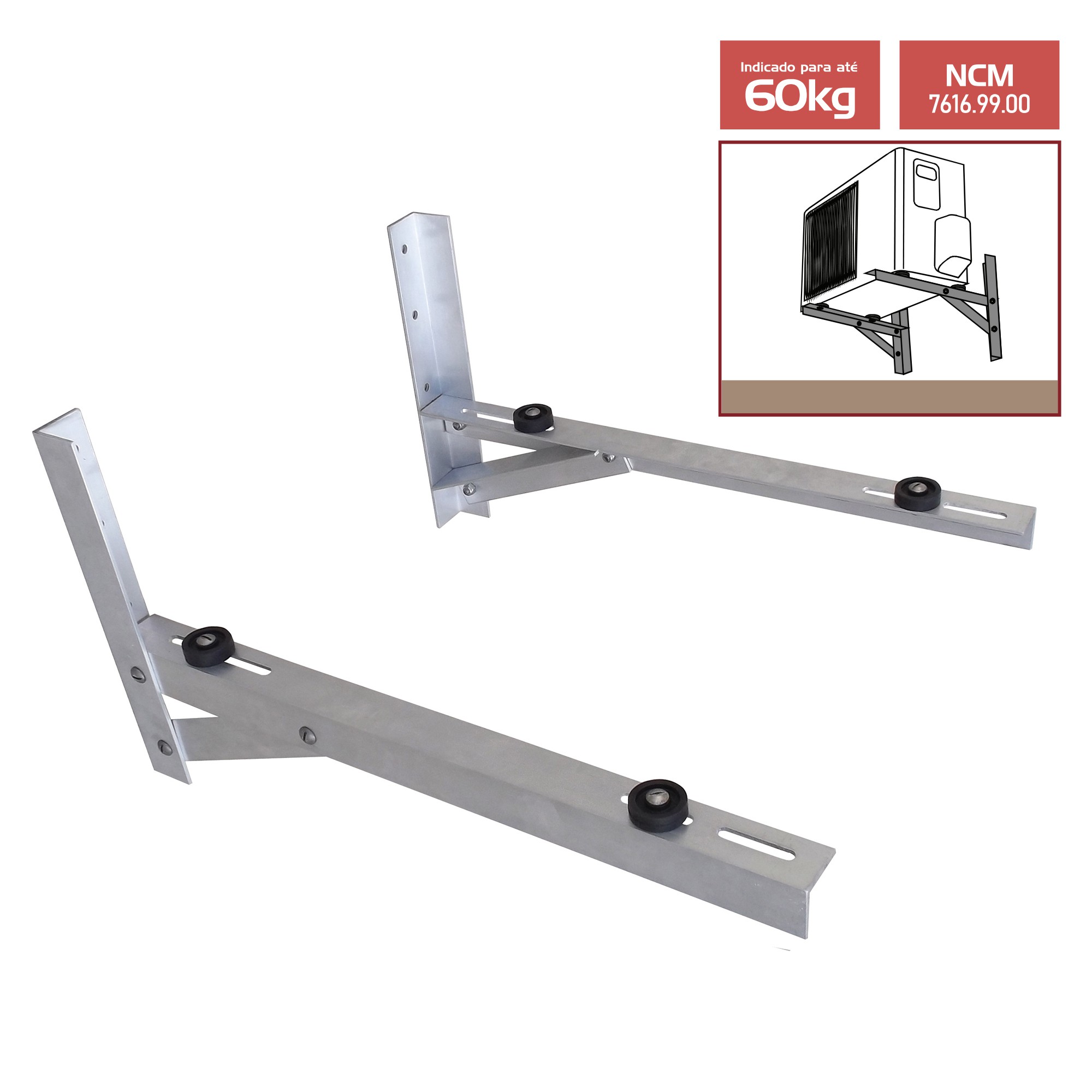 Suporte para ar condicionado tipo Split 50 cm. Resistente não enferruja e suporta interpéries (sol, chuva, maresia). Utilizado externamente para sustenção de ar condicionado tipo Split. Acompanha parafusos, chumbadores, buchas, porcas e manual para instalação.